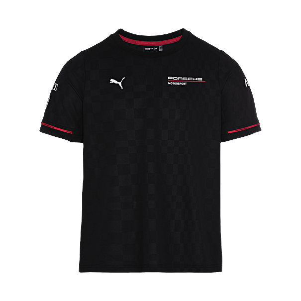 Esta camiseta esportiva masculina impressiona com seu caimento leve e sob medida, oferecendo conforto e liberdade de movimentos. Visualmente, a camiseta chama a atenção graças ao padrão Pasha em toda a peça. A gola redonda clássica, o debrum vermelho e as letras Porsche adicionam toques dinâmicos. O caráter automobilístico é enfatizado pelo logotipo e pelas estampas dos patrocinadores, além da etiqueta Raceborn nas costas.