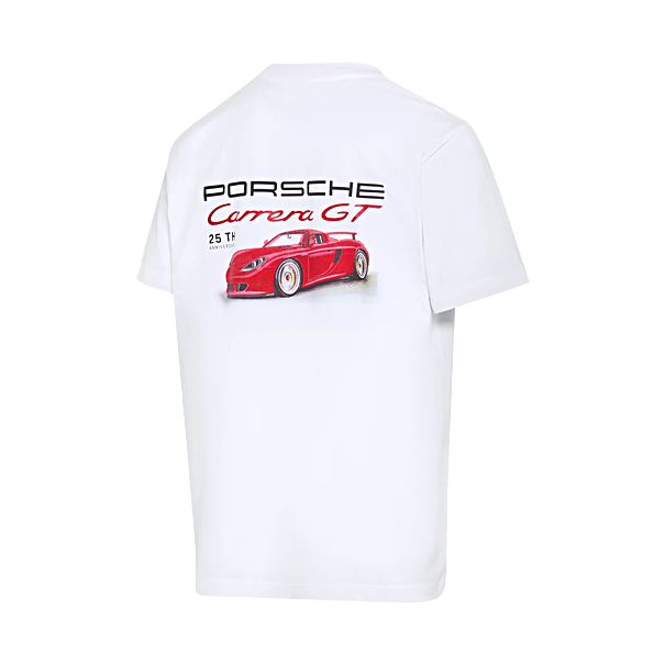 Feito de carbono, som e curvas, o Porsche Carrera GT representa muito mais do que velocidade. A coleção 25Y Porsche Carrera GT celebra o 25º aniversário do icônico carro esportivo com peças que combinam design e desempenho de uma forma inovadora. Esta camiseta unissex causa um impacto visual marcante: uma estampa gráfica nas costas com o Porsche Carrera GT e a inscrição "Porsche Carrera GT" se une a uma frente minimalista com o logotipo da Porsche – uma peça que realmente se destaca.