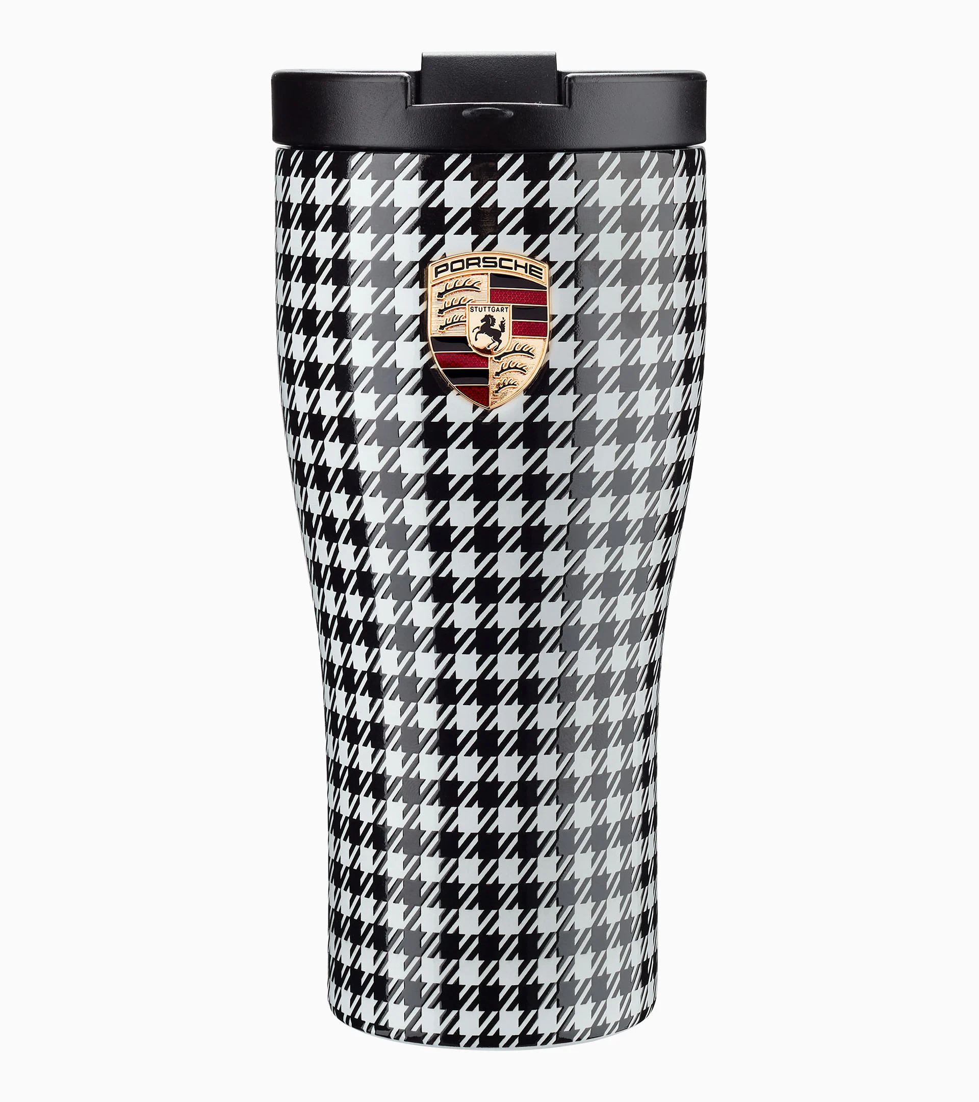 Alto desempenho para levar: o copo térmico Porsche de parede dupla no design exclusivo Pepita mantém as bebidas quentes quentes e as bebidas frias frescas. O corpo do copo é decorado com o brasão da Porsche e a tampa com letras Porsche em relevo. A embalagem de alta qualidade também o torna ideal como um presente para todos os fãs da Porsche. O copo com capacidade de aprox. 460 ml é o companheiro ideal para a estrada.