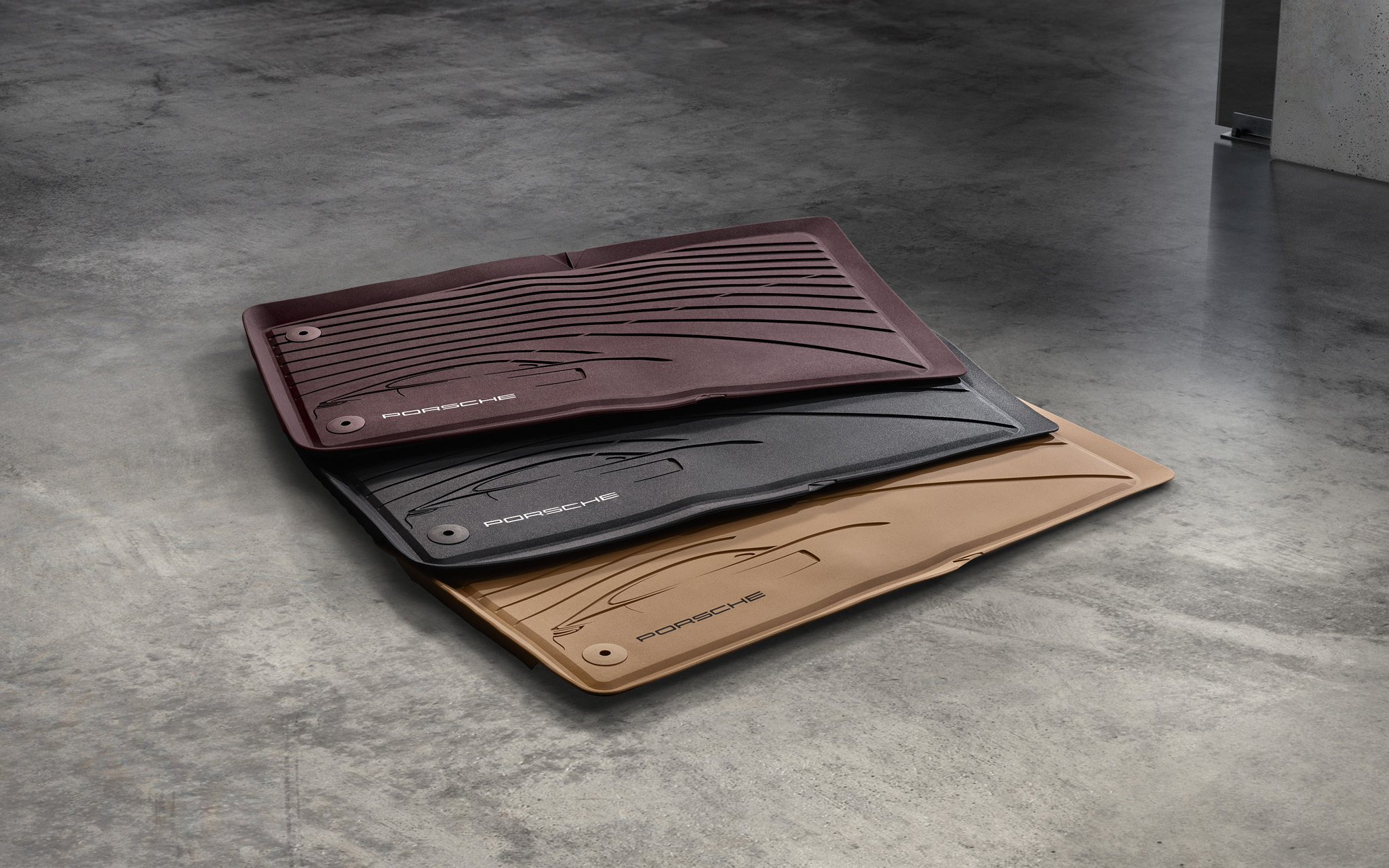 Conjunto de 4 tapetes pretos para todas as condições atmosféricas com um design elegante, com a silhueta do veículo e a inscrição “PORSCHE”. Antiderrapante e impermeável, com rebordo em relevo a toda a volta.